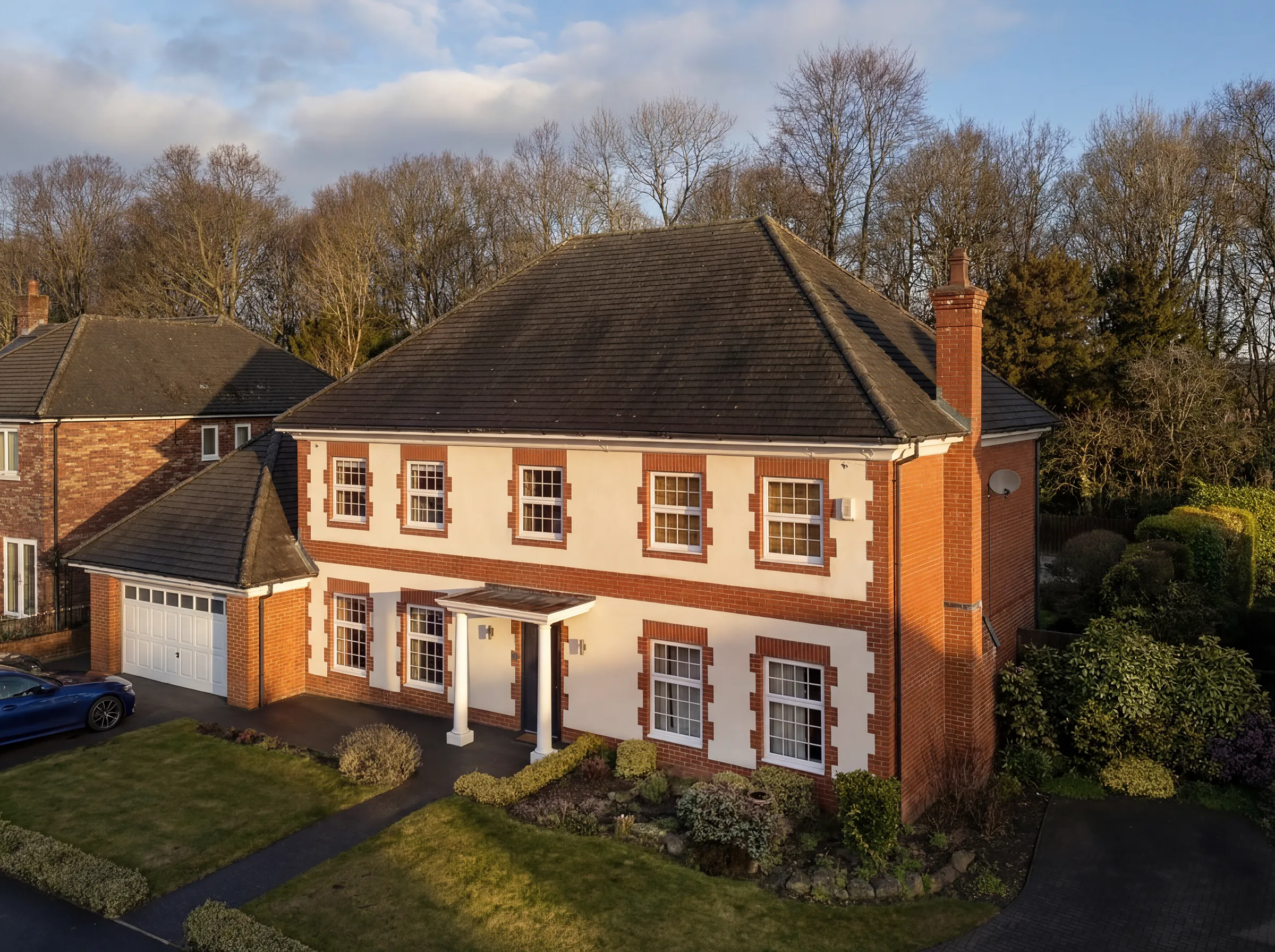 The result is a moment-based exterior photograph. Captured from a slightly elevated position, the house sits more clearly within its setting, giving it a stronger presence in listings.